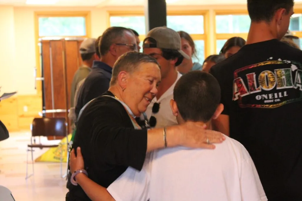 Picture of Jacqui with her arm around camper in white shirt: After speaking to groups, Jacqui & Yaron share that they are ok with hugs, many campers waited their turn in line to give a hug of support; after hearing the story they were feeling a special connection to the couple.